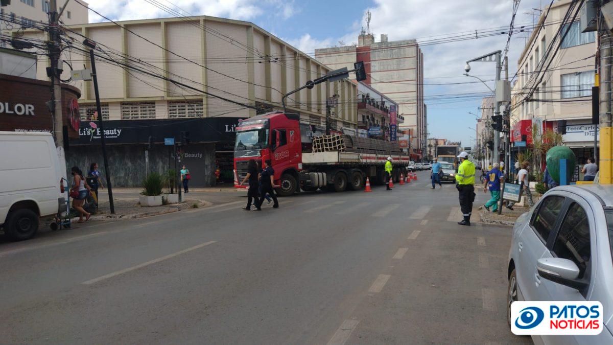 Carreta atinge semáforo no Centro de Patos de Minas
